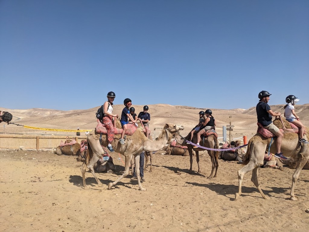 – Kfar Hanokim Bedouin camp site: Back to reality, our bedouin tent experience was awesome. There are many accommodation options (most fun being outside tent sleeping) but we opted for the one bedroom stone house with separate beds for the kids in the living room. We were excited to hear they had a splash pad section of the camp with water sprays everywhere and hammocks and swings to play on. We also bought some jewelry from the shuk on site and took some awesome pictures with the mountainous background in perfect sunlight. This was followed by a fascinating talk with a bedouin woman over tea, a delicious bedouin dinner feast, and then a late night scorpion hunt! We felt really bad for the people who showed up in crocs since no one was allowed unless they had fully closed toe shoes. The scorpion tour was incredible for all of us.