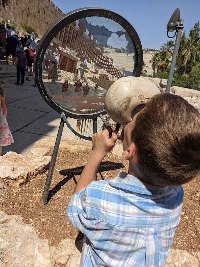 – Archaeological Park- Davidson Center: Next we walked through the Jewish quarter and passed the Western Wall again (this time with notes!) on our way to the Davidson Center. We had a little bit of a hard time finding the Davidson Center and no one we asked had heard of it because I guess it has a few names. It may be easier to call it the Archaeological Park. Regardless, don’t give up and find it! You get to see interactive exhibits and really interesting videos on the inside, and then visit the old steps that led to the second temple courtyard that people used to walk up to get to the temple! You can look through this telescope to see an overlay of what it looked like back then which we enjoyed. This was a really cool stop. Plus they were digging and finding things while we were there!