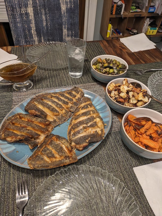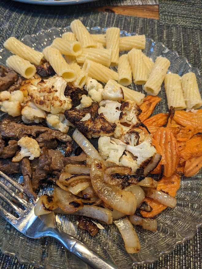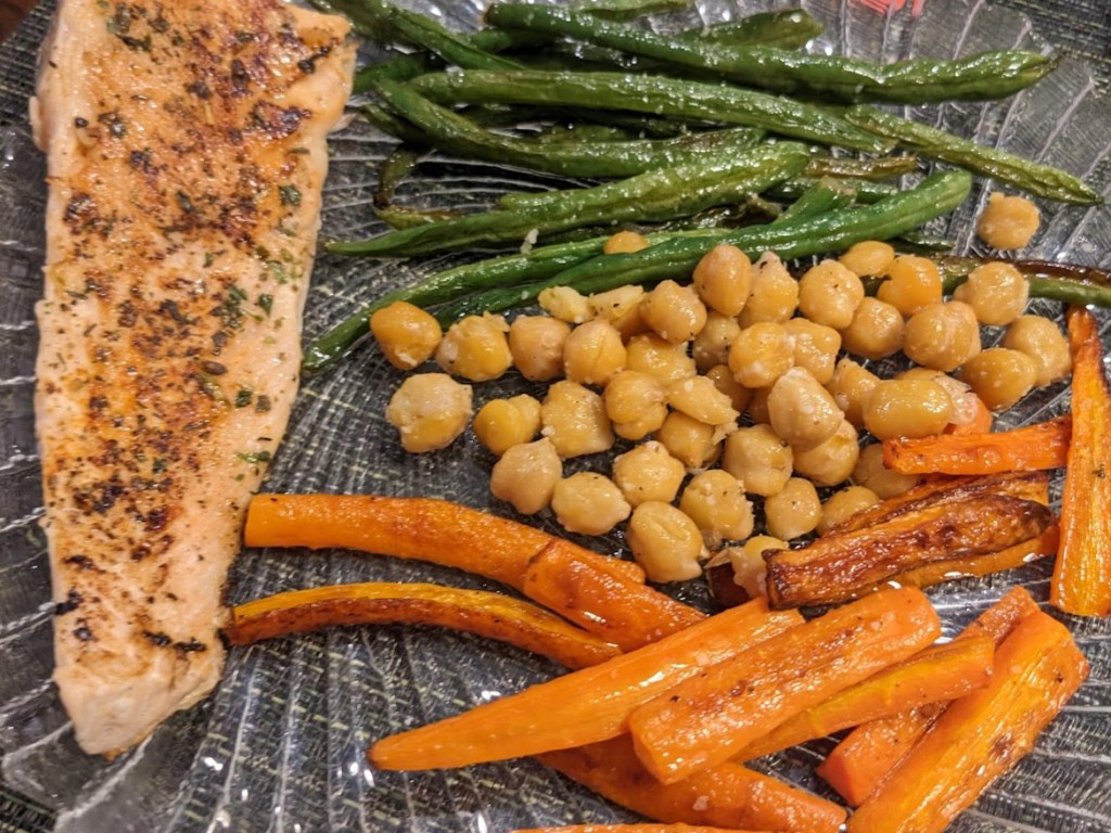 Every night we make one protein, one carb, and two or more roasted vegetables. We always cook the protein and vegetables from scratch and not from the frozen food aisle. My husband does the protein and I’m in charge of the vegetables. We take turns on the carb, which is usually an afterthought and could be a quiche, pasta, potato, or a fresh baguette.